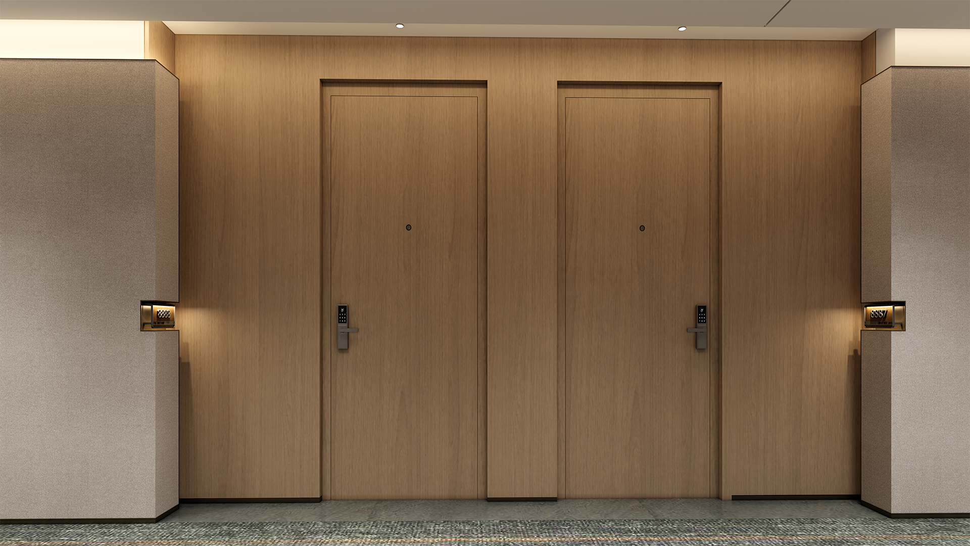 A sleek and durable hotel fire door in a modern hallway, offering safety and style for premium hospitality spaces.